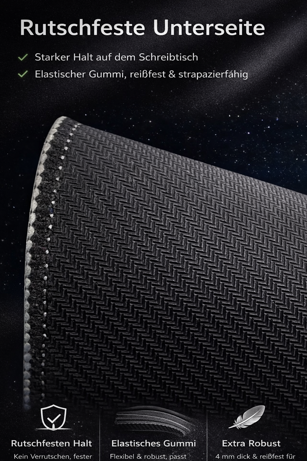 La base en caoutchouc antidérapante, souple et dense, maintient le tapis de souris bien en place. Elle assure un mouvement stable de la souris. Concentrez-vous entièrement sur votre travail ou votre jeu – sans que le tapis de souris ne glisse.